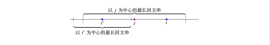 那么,如果 $j < i$ 且 $j+R[j] > i$;作 $i$ 点关于 $j$ 的对称点 $i’$,则必有 $i’ > j-R[j]$。
